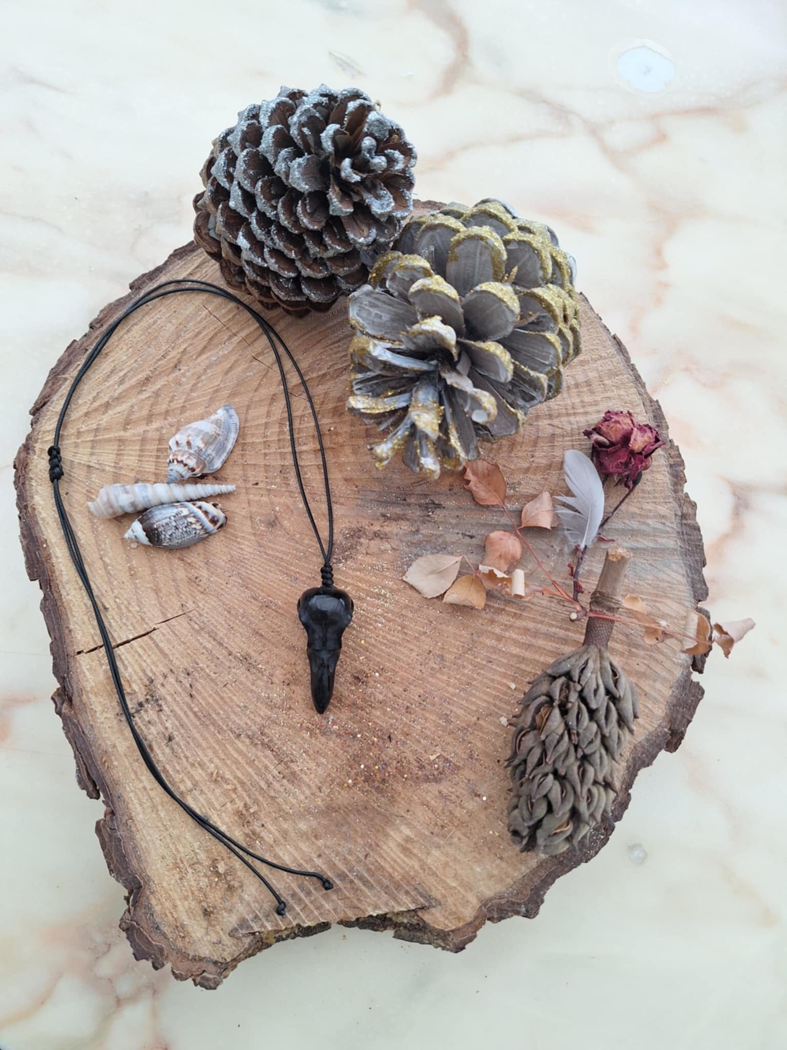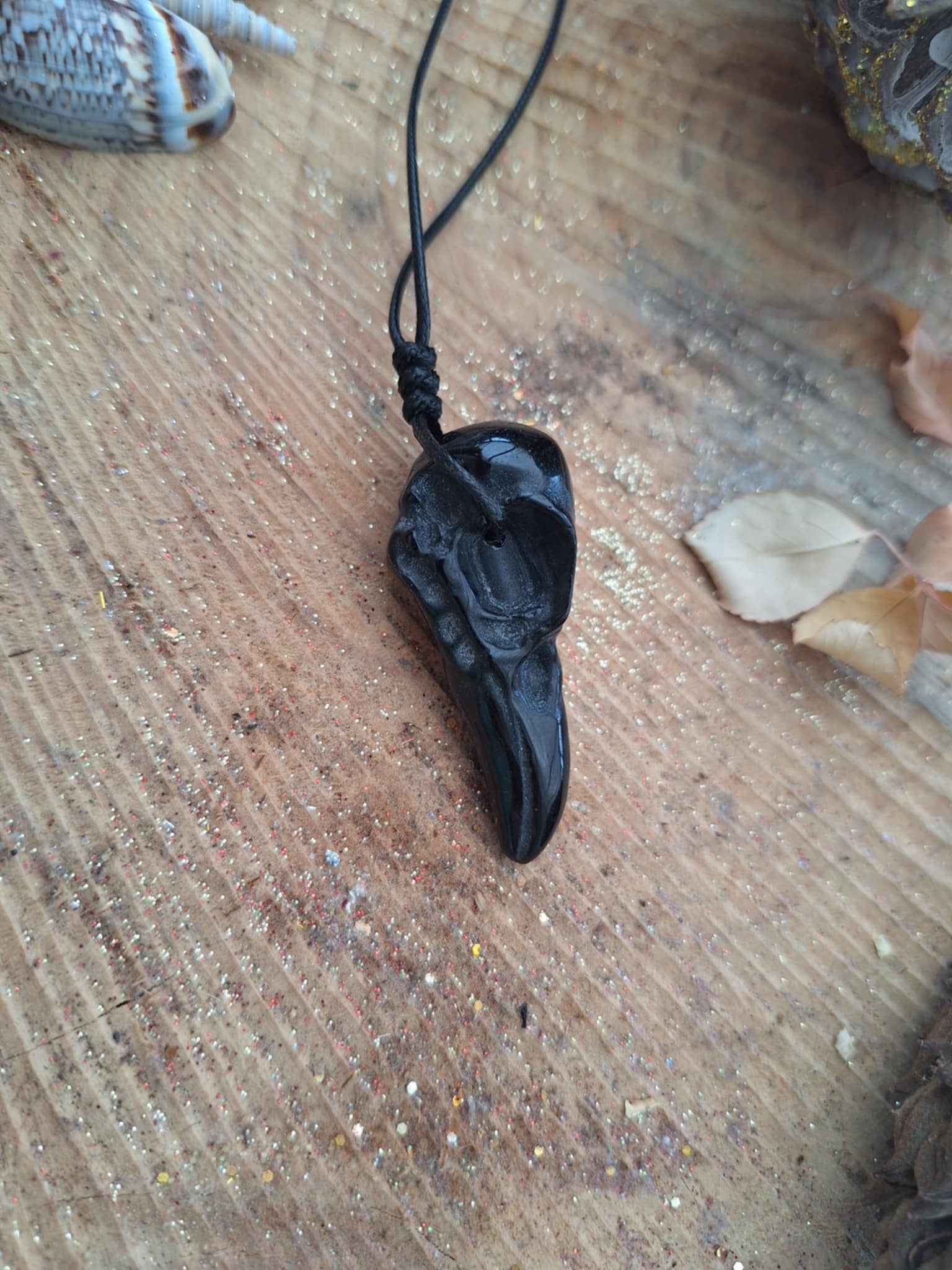 Cordon en coton ciré réglable jusqu'à 45cm et le crane en obsidienne mesure 5cm environ.