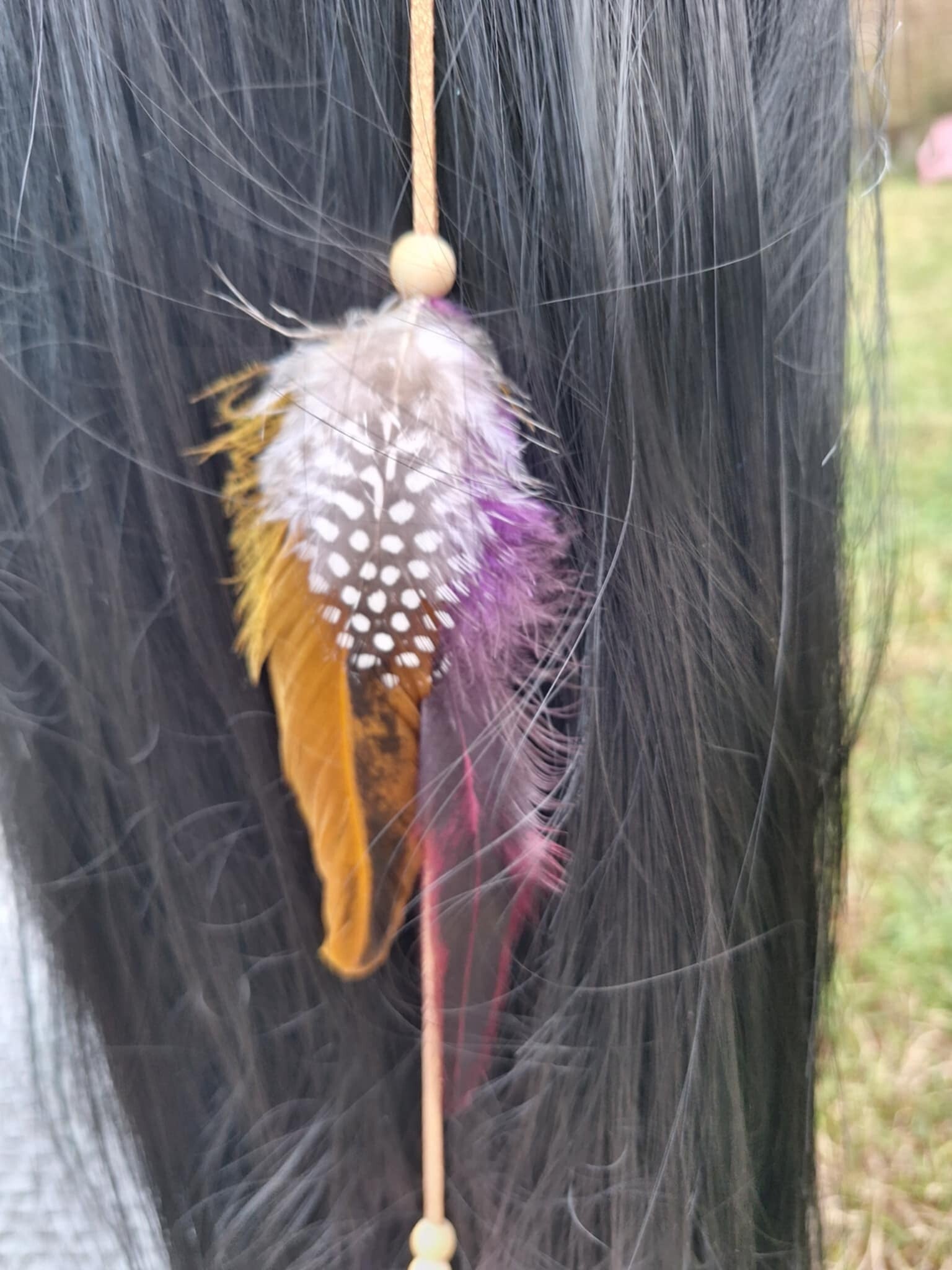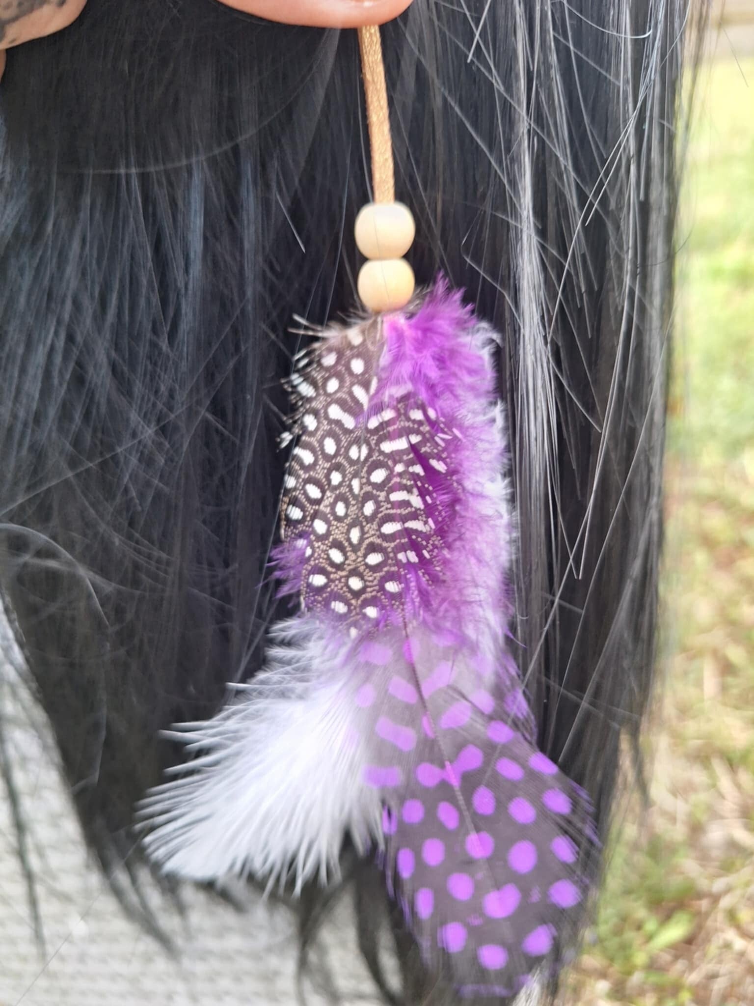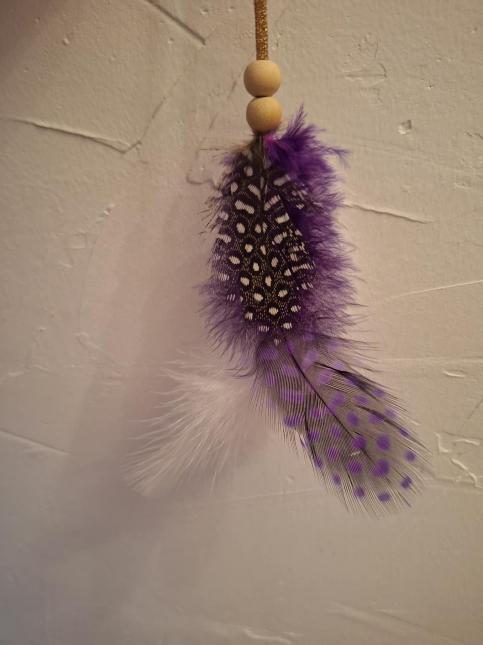 Clips avec cordon de suédine en couleur. Perles en bois. Plumes véritable. Certains avec breloques.