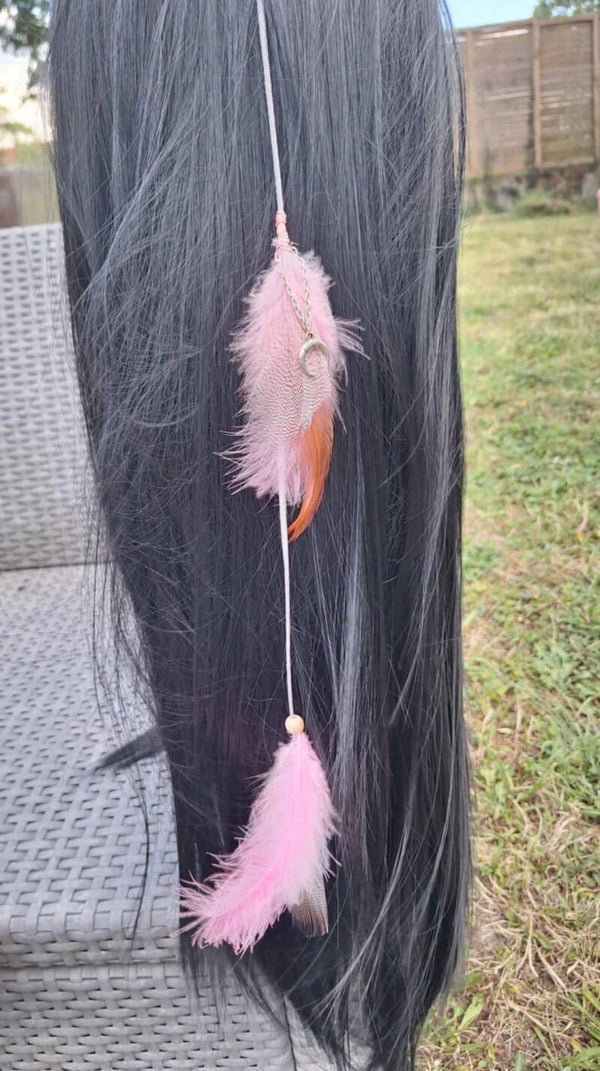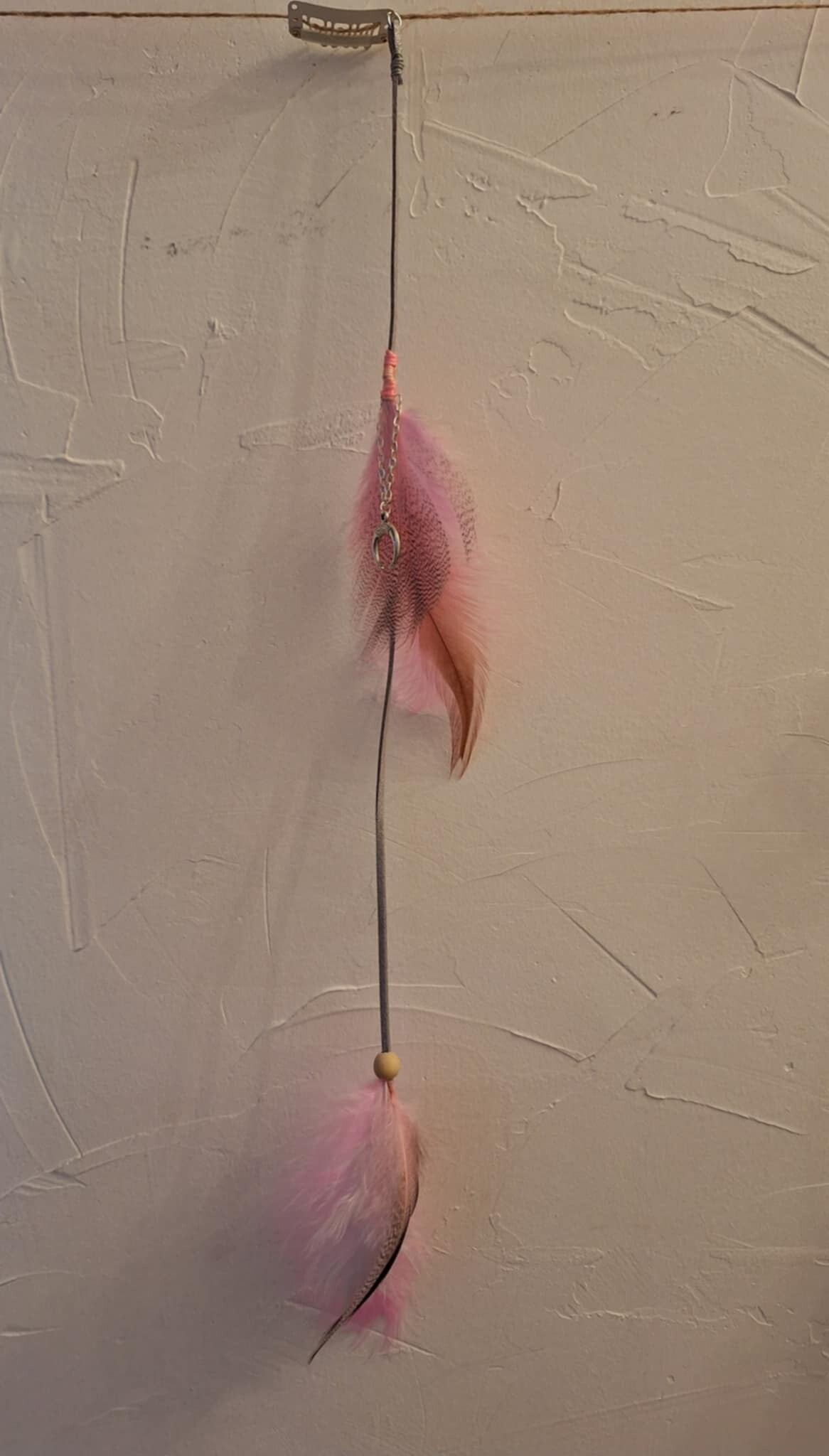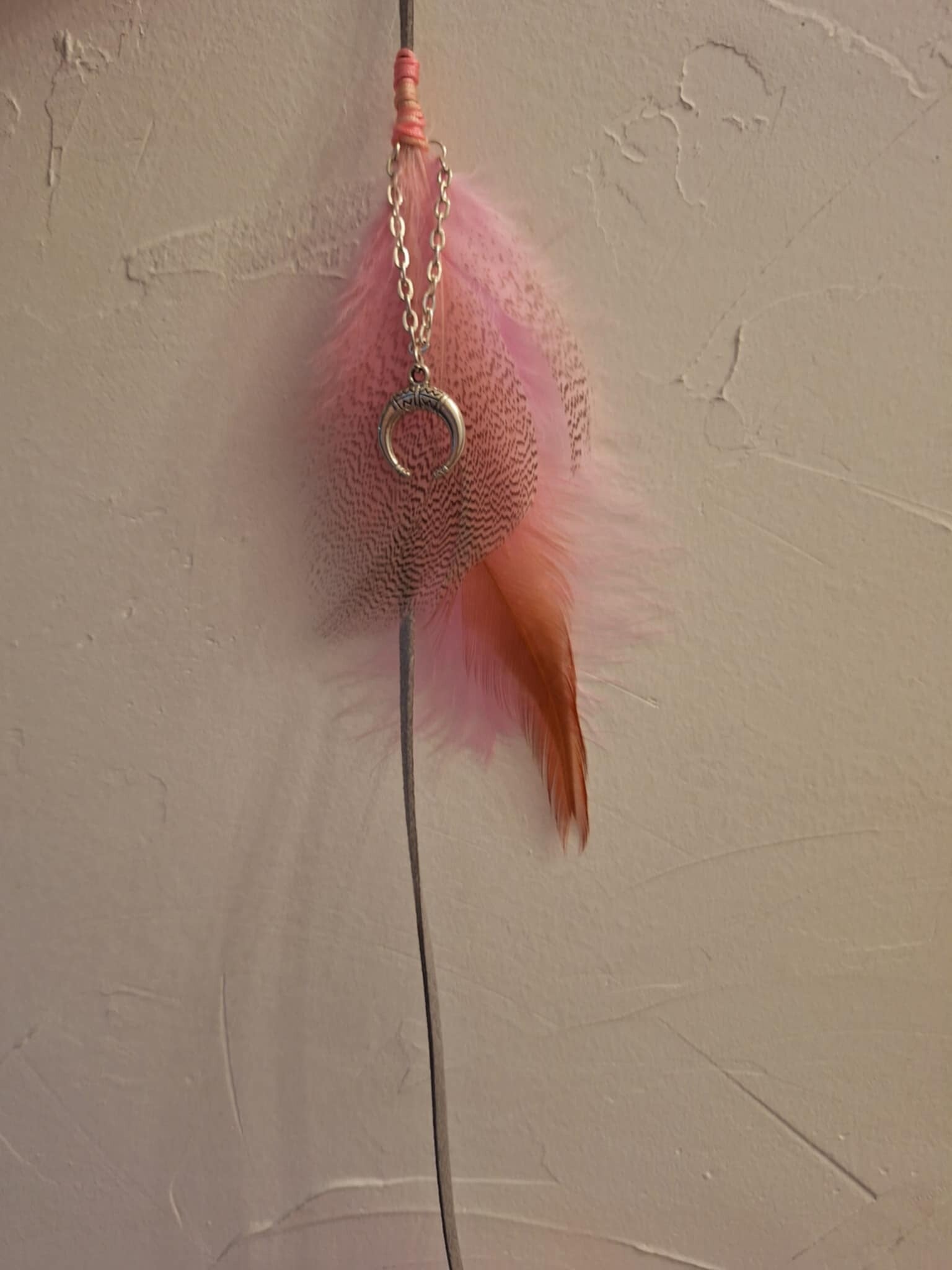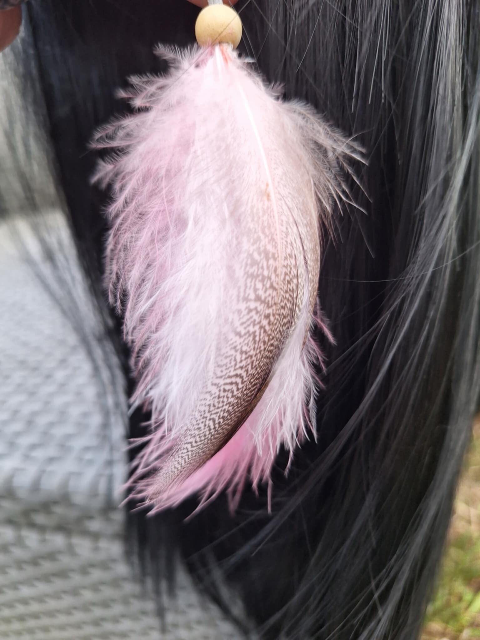 Clips avec cordon de suédine en couleur. Perles en bois. Plumes véritable. Certains avec breloques.