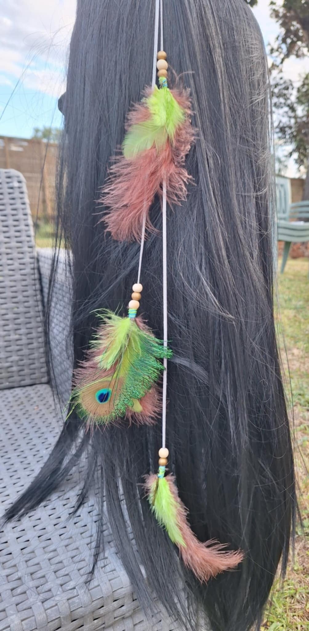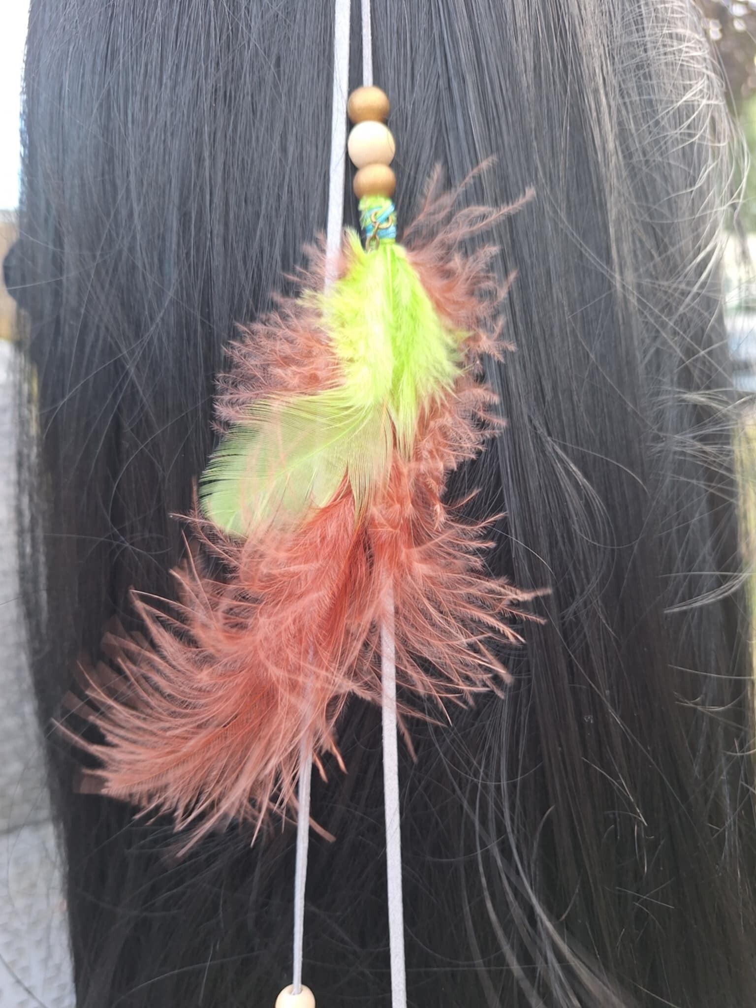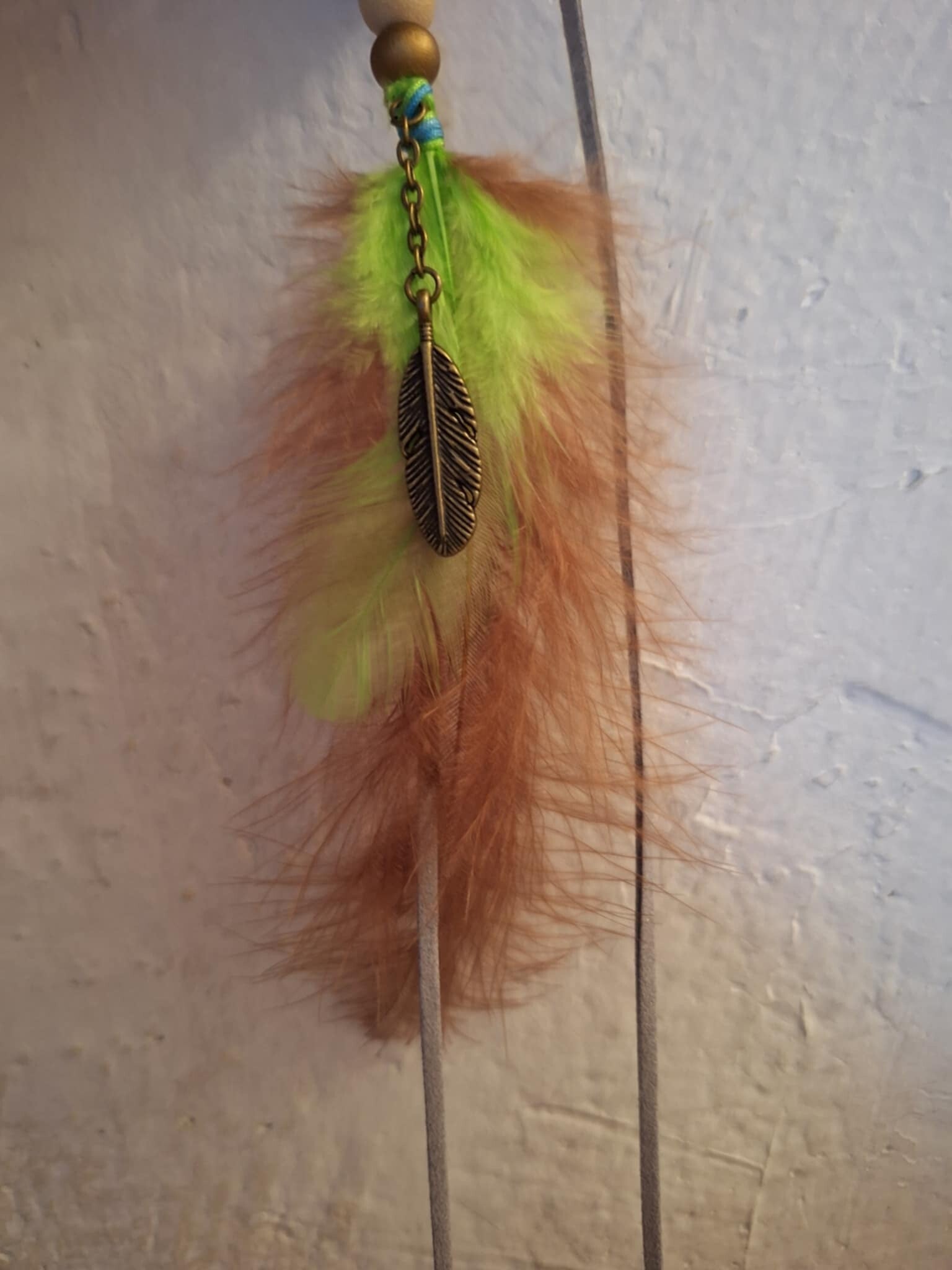 Clips avec cordon de suédine en couleur. Perles en bois. Plumes véritable. Certains avec breloques.