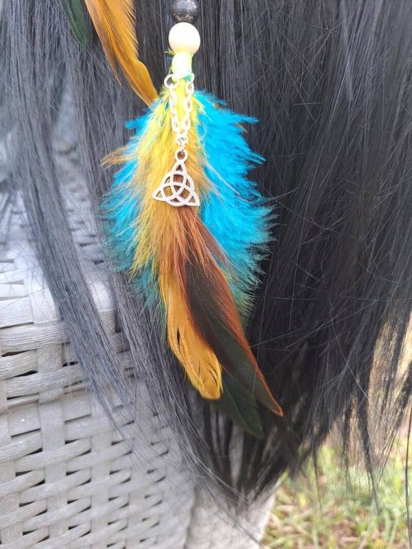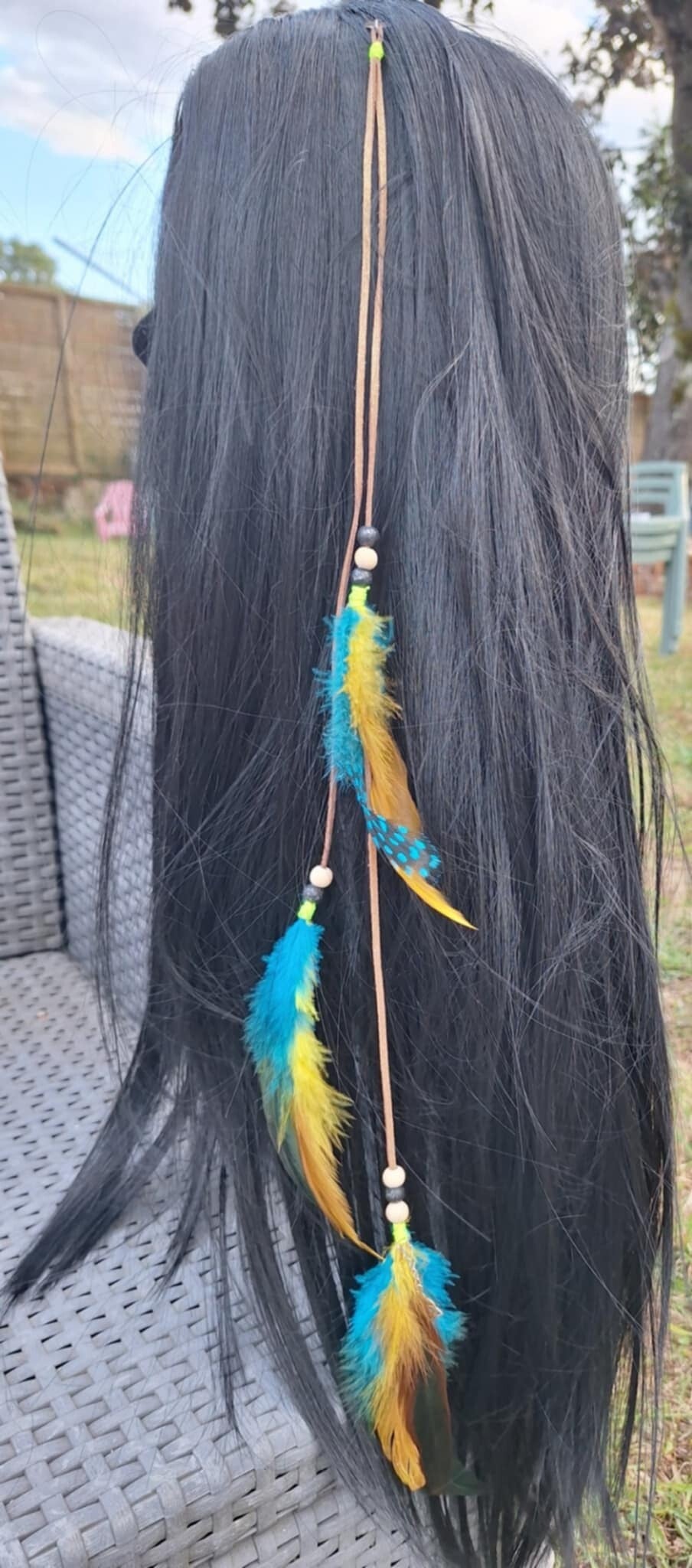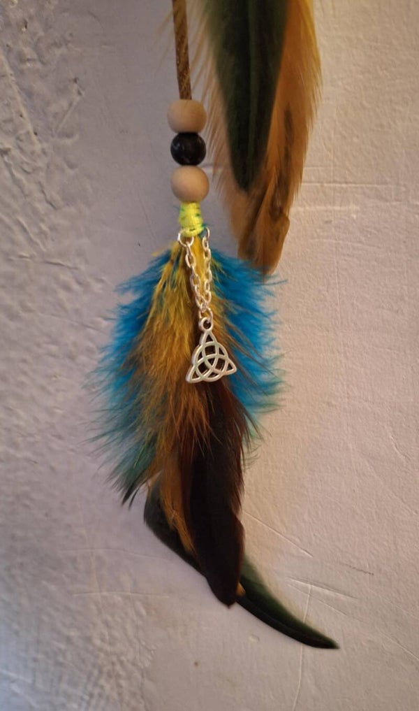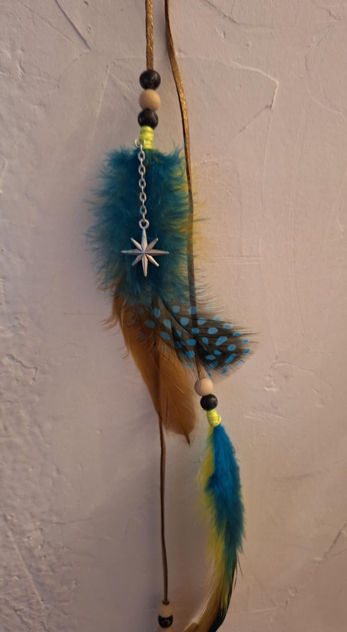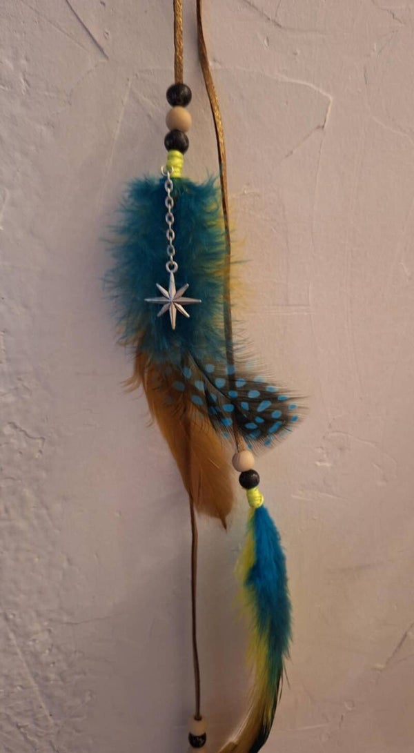 Clips avec cordon de suédine en couleur. Perles en bois. Plumes véritable. Certains avec breloques.